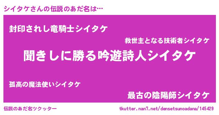 | 男性向けラノベタイトル風あだ名 | 『シイタケという概念が存在しない退屈な世界 』 |