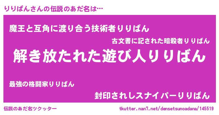 | 男性向けラノベタイトル風あだ名 | 『りりばんの嫁は女の子じゃないと思った?』 |