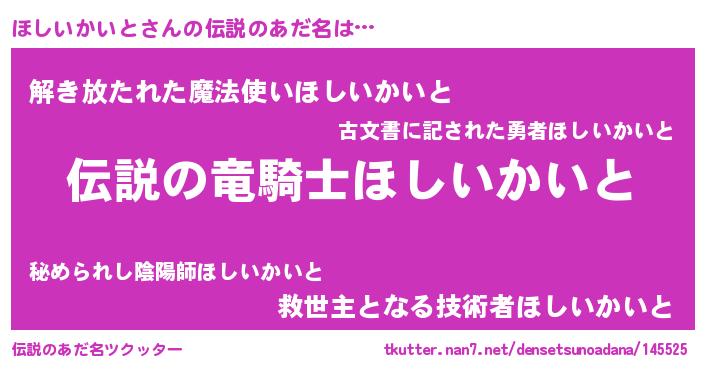| ヒーロー風カッコイイあだ名 | 『スーパーホシイカイト』『銀牙騎士ホシ』 |