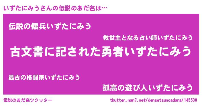 | 男性向けラノベタイトル風あだ名 | 『Re:いずたにみうから始める異世界生活』 |