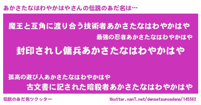 | 女子向けラノベタイトル風あだ名 | 『悪役あかさたなはわやかはやに転生したようですが、知った事ではありません』 |