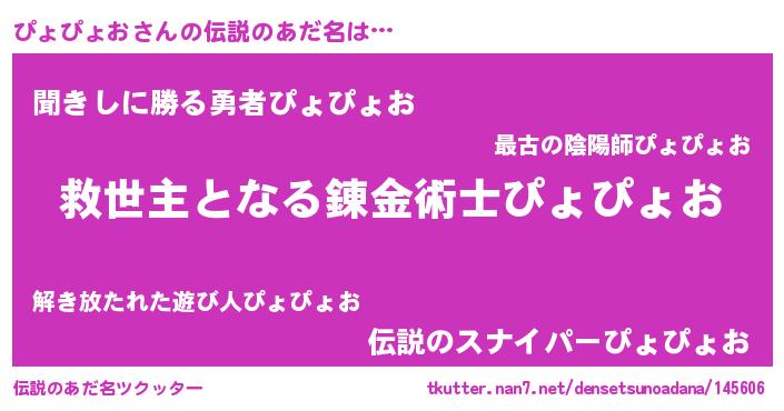 | ヒーロー風カッコイイあだ名 | 『慈愛の使者ぴょぴょお』『仮面ピョダー』 |