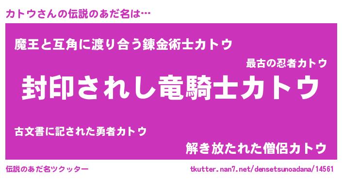 | 男性向けラノベタイトル風あだ名 | 『カトウ~年齢イコール彼女いない歴の魔法使い~』 |