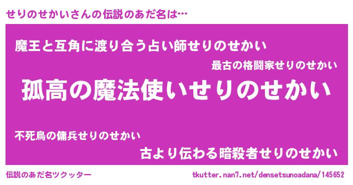 | 胡散臭い通販商品みたいなあだ名 | 『信頼と実績のサプリメント…その名も「せりのせかい」』 |