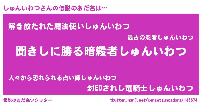 | 男性向けラノベタイトル風あだ名 | 『しゅんいわつという概念が存在しない退屈な世界 』 |