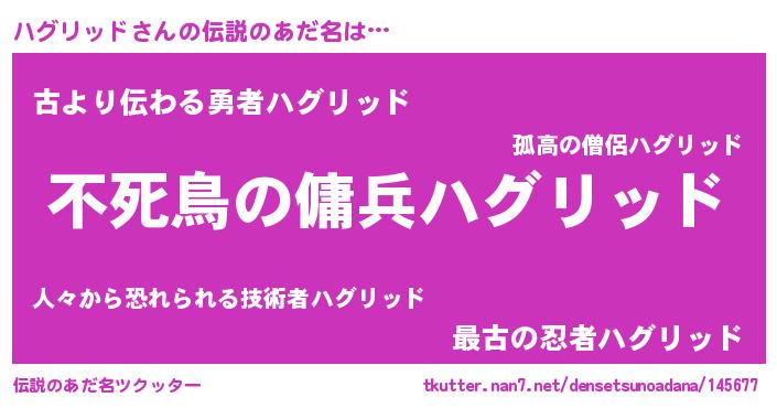 | 女子向けラノベタイトル風あだ名 | 『ハグリッド姫と円卓の騎士』 |