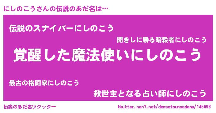 | 男性向けラノベタイトル風あだ名 | 『にしのこう~年齢イコール彼女いない歴の魔法使い~』 |