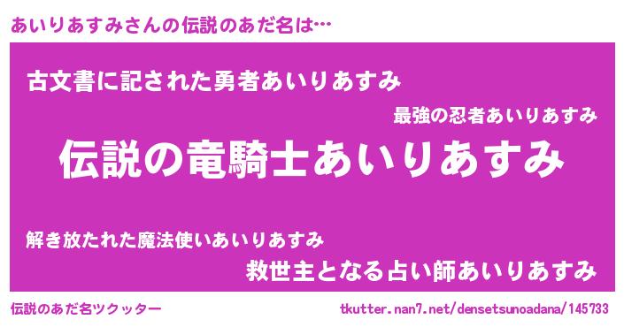 | 胡散臭い通販商品みたいなあだ名 | 『必ず成功するブレスレット…その名も「あいりあすみ」』 |
