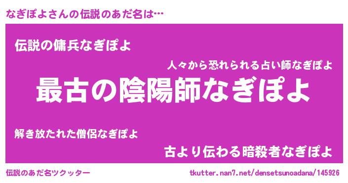 | ファンタジー風あだ名 | 『エターナルナギポヨー』『ゼナギトゥ』 |