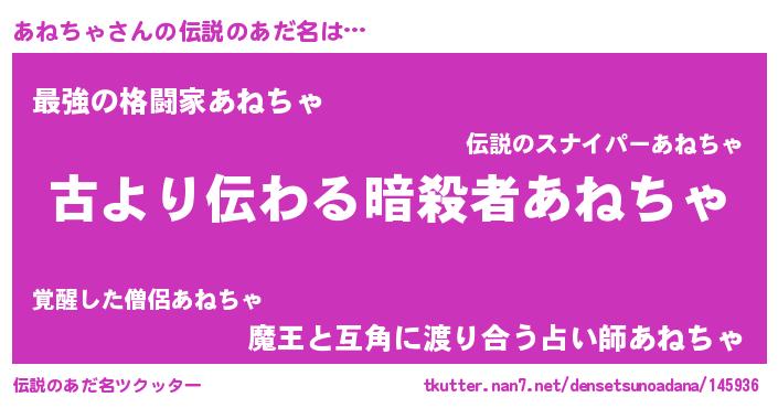 | 意味不明あだ名 | 『永久保存あねちゃ』『自称あねちゃ』 |