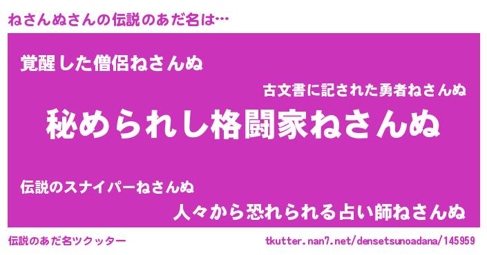 | 男性向けラノベタイトル風あだ名 | 『魔弾の王とねさんぬ』 |