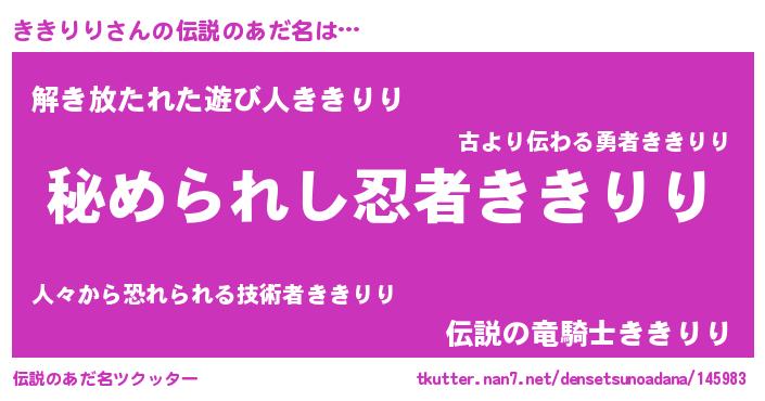| 意味不明あだ名 | 『自称ききりり』『ききりりフォーエバー』 |