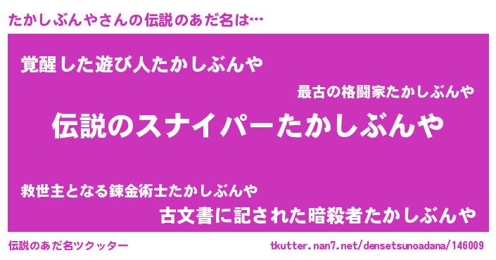 | ヒーロー風カッコイイあだ名 | 『スーパータカシブンヤ』『幻影騎士タカ』 |