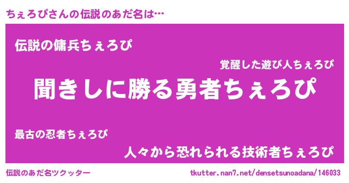 | 女子向けラノベタイトル風あだ名 | 『異世界で失敗しない100のちぇろぴ』 |