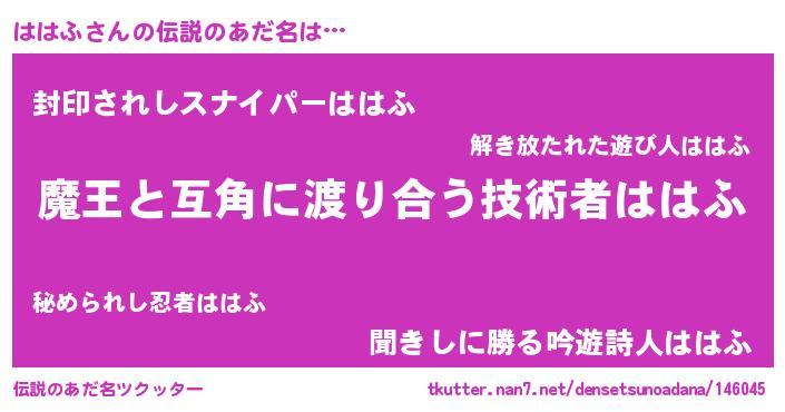 | 男性向けラノベタイトル風あだ名 | 『ノーゲーム・ノーハハフ』 |