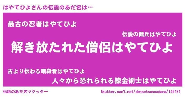 | ポケモン風あだ名 | 『ヒハヤテヒヨ』『メロハッヤ』 |