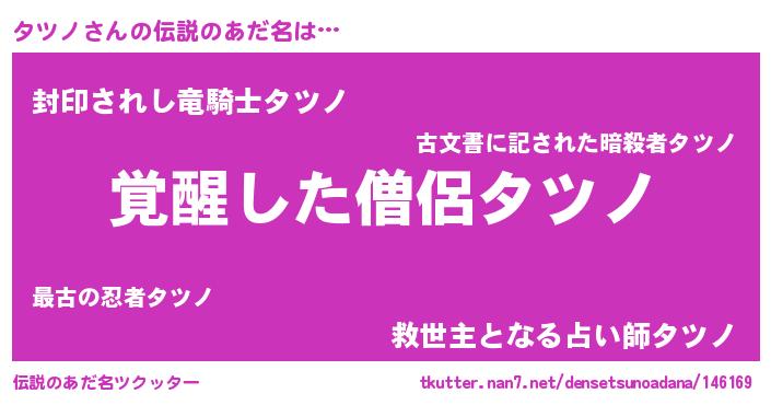 | 男性向けラノベタイトル風あだ名 | 『タツノ~年齢イコール彼女いない歴の魔法使い~』 |