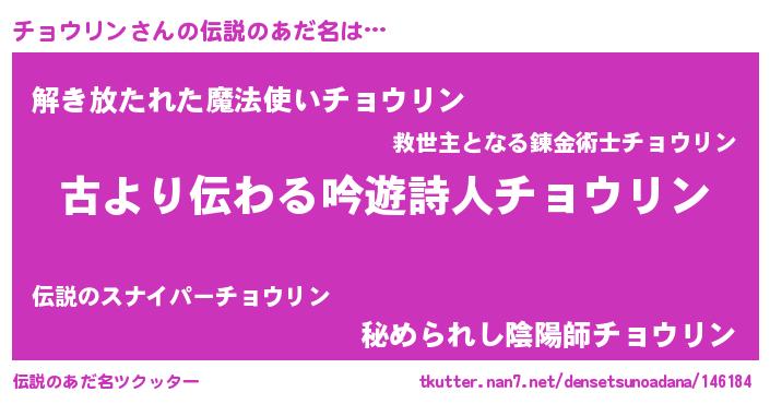 | 男性向けラノベタイトル風あだ名 | 『チョウリンという概念が存在しない退屈な世界 』 |
