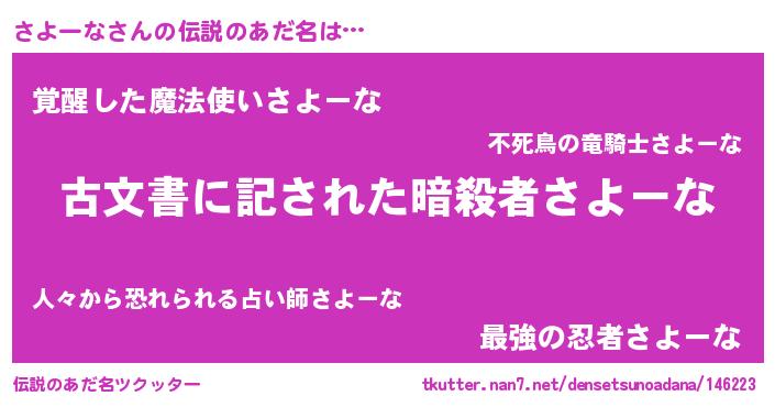 | 意味不明あだ名 | 『住所不定無職さよーな(68歳)』 |