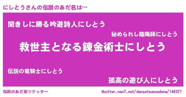 | 男性向けラノベタイトル風あだ名 | 『ノーゲーム・ノーニシトウ』 |