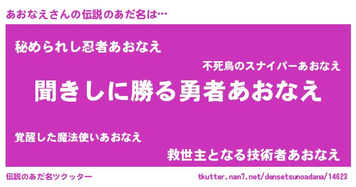 | 女子向けラノベタイトル風あだ名 | 『異世界で失敗しない100のあおなえ』 |