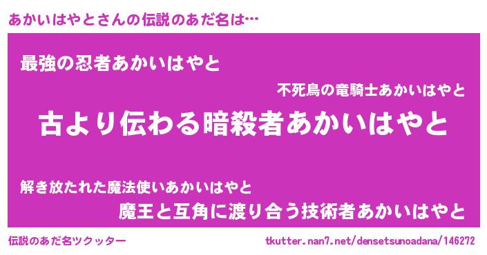 | 意味不明あだ名 | 『住所不定無職あかいはやと(40歳)』 |