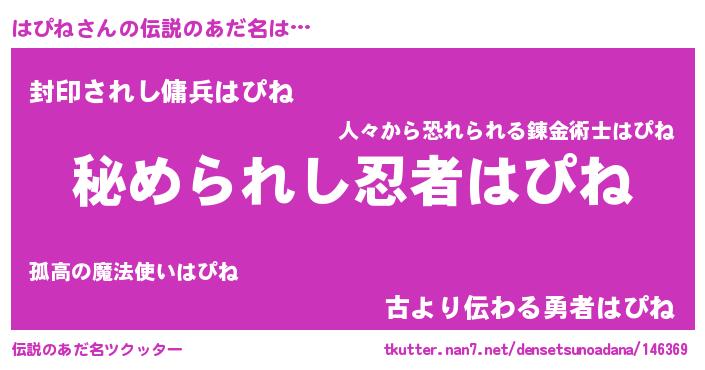 | 意味不明あだ名 | 『エリンギ科はぴね属』『ペロリンはぴね』 |