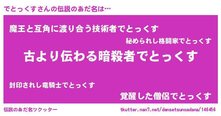 | 男性向けラノベタイトル風あだ名 | 『でとっくすという概念が存在しない退屈な世界 』 |