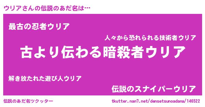 | 男性向けラノベタイトル風あだ名 | 『魔弾の王とウリア』 |