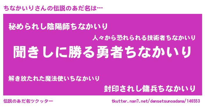 | 男性向けラノベタイトル風あだ名 | 『ちなかいりという概念が存在しない退屈な世界 』 |