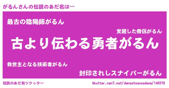 | 女子向けラノベタイトル風あだ名 | 『がるんの契約王妃』『闇のがるん』 |