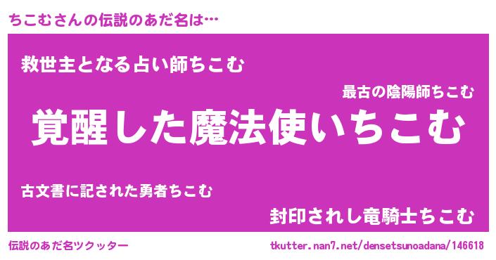 | 男性向けラノベタイトル風あだ名 | 『ちこむの嫁は女の子じゃないと思った?』 |