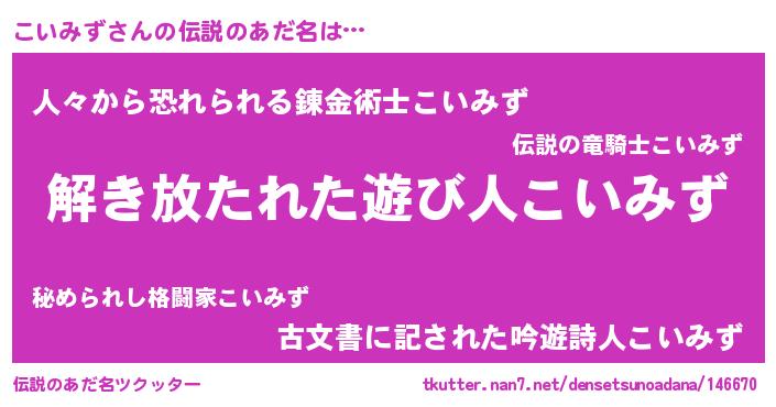 | 意味不明あだ名 | 『自称こいみず』『永久保存こいみず』 |