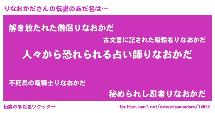 | 男性向けラノベタイトル風あだ名 | 『おまえをオタクにしてやるから、俺をりなおかだにしてくれ! 』 |