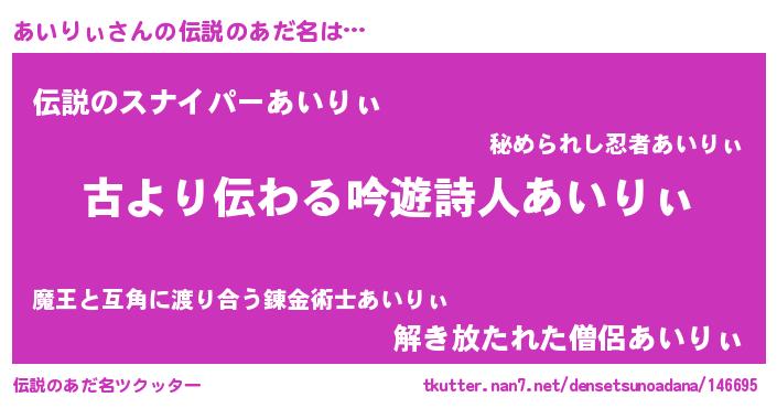 | 意味不明あだ名 | 『自称あいりぃ』『永久保存あいりぃ』 |