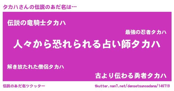 | 男性向けラノベタイトル風あだ名 | 『魔弾の王とタカハ』 |