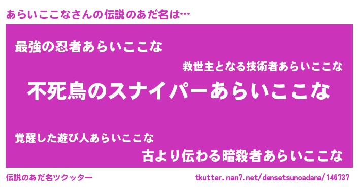 | ヒーロー風カッコイイあだ名 | 『スーパーアライココナ』『仮面アラダー』 |
