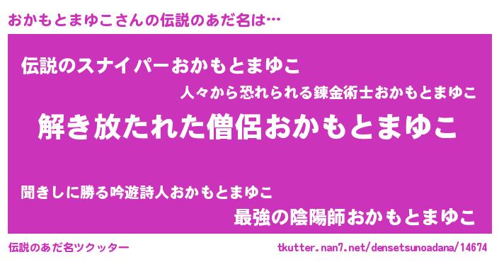 | 男性向けラノベタイトル風あだ名 | 『魔弾の王とおかもとまゆこ』 |