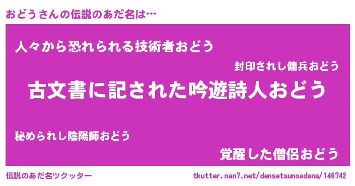 | 男性向けラノベタイトル風あだ名 | 『おどうに滅ぼされるだけの簡単なお仕事です』 |