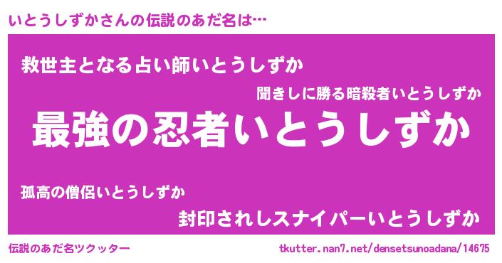 | ヒーロー風カッコイイあだ名 | 『最強戦士イトウシズカ』『仮面イトダー』 |