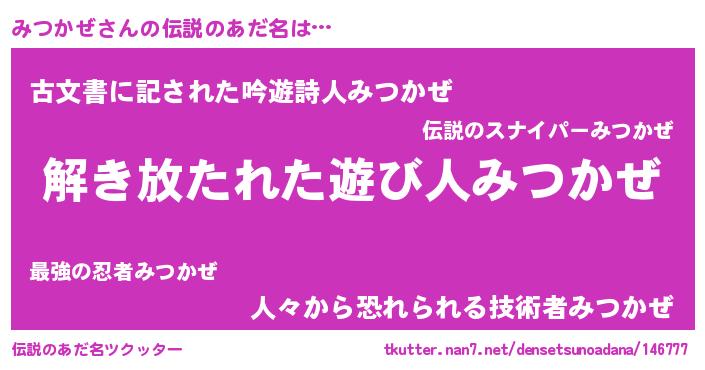 | ヒーロー風カッコイイあだ名 | 『魔戒騎士ミツ』『ネオミツカゼ』 |