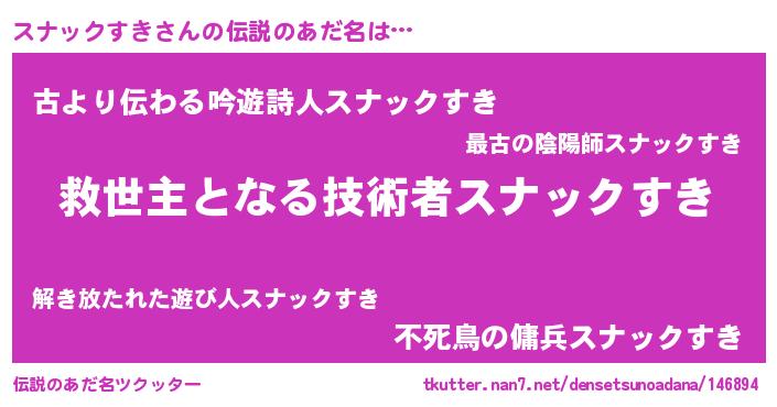 | 男性向けラノベタイトル風あだ名 | 『この素晴らしい世界にスナックすきを!』 |