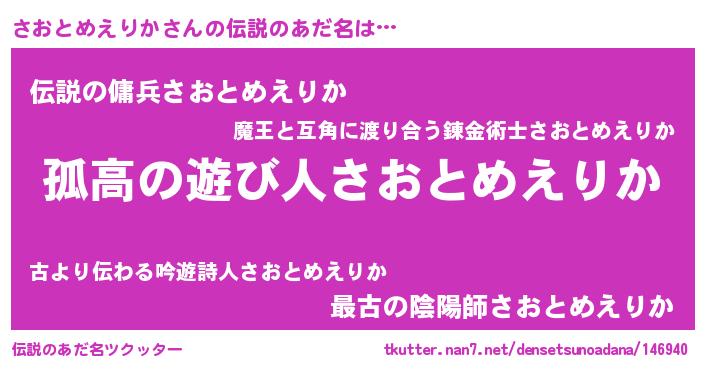 | ヒーロー風カッコイイあだ名 | 『魔戒騎士サオ』『ネオサオトメエリカ』 |