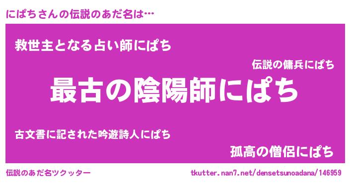 | 女子向けラノベタイトル風あだ名 | 『にぱち伯爵の花嫁』『死神にぱちの再婚』 |