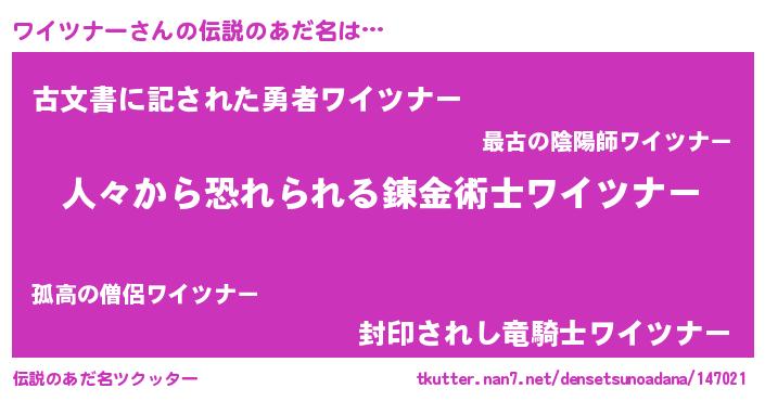 | 男性向けラノベタイトル風あだ名 | 『ワイツナースレイヤー』 |