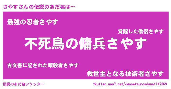 | 男性向けラノベタイトル風あだ名 | 『この素晴らしい世界にさやすを!』 |