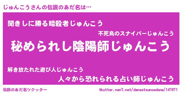 | ファンタジー風あだ名 | 『エターナルジュンコウー』『ゼジュトゥ』 |