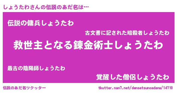 | ヒーロー風カッコイイあだ名 | 『慈愛の使者しょうたわ』『仮面ショダー』 |