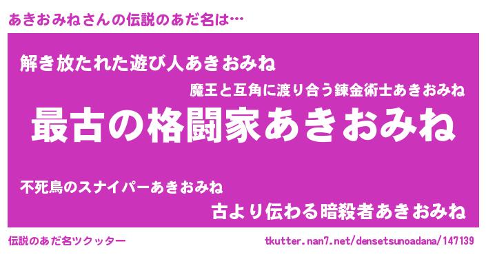 | 男性向けラノベタイトル風あだ名 | 『この素晴らしい世界にあきおみねを!』 |
