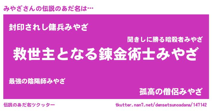 | 男性向けラノベタイトル風あだ名 | 『この素晴らしい世界にみやざを!』 |